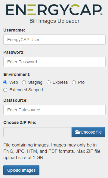 Use your Utility Management credentials and datasource name, to upload files at https://billimages.energycap.com/.