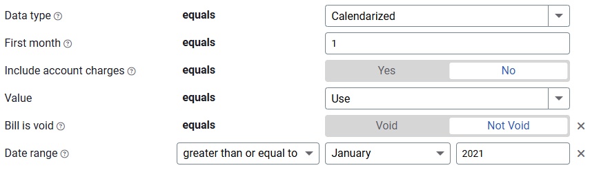 - Bill is void—If this filter is not included, both void and not void bills are included.